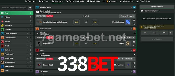 O 338Bet oferece uma grande seleção de opções de apostas em e-sports com probabilidades competitivas